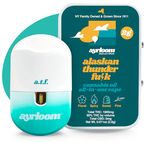 Experience the electrifying effects of Alaskan Thunder Fuck, now available in ayrloom's 2g all-in-one device. This iconic sativa strain is known for its powerful, uplifting high that energizes the mind and body, making it perfect for daytime use. Alaskan Thunder Fuck offers a pungent, earthy flavor with hints of citrus and pine, delivering a smooth yet potent vaping experience. Its terpene profile, featuring pinene and limonene, enhances its refreshing and invigorating effects.