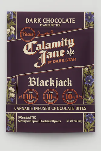 The Dark Star Calamity Jane – Focus Bar in Blackjack Dark Chocolate Peanut Butter (100mg) is a flavorful edible designed for clarity and drive. Infused with the energizing hybrid strain Blackjack—a cross of Black Domina and Jack Herer—this bar delivers uplifting cerebral effects with just enough body balance to keep you grounded.