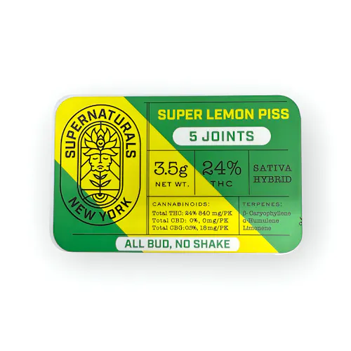 Supernaturals turns up the citrus with their Super Lemon Piss, a 5-pack of 0.7g pre-rolls (3.5g total) that hit hard with flavor and potency. This batch tested at 24% THC and 2.22% total terpenes, led by beta-caryophyllene, alpha-humulene, and alpha-bisabolol. Crack open the pack and you’re met with a punch of sharp lemon peel, fresh pine, and gassy diesel, wrapped in a subtle floral sweetness. On the palate, it delivers sour citrus up front, earthy spice through the middle, and a lingering funky finish that lives up to the name. The effects bring a fast-hitting sativa hybrid lift—energizing, euphoric, and creatively charged—perfect for powering through the day or keeping the mood lively. Ideal for sparking conversation in Bushwick, Brooklyn or riding the vibe out in New Dorp, Staten Island.